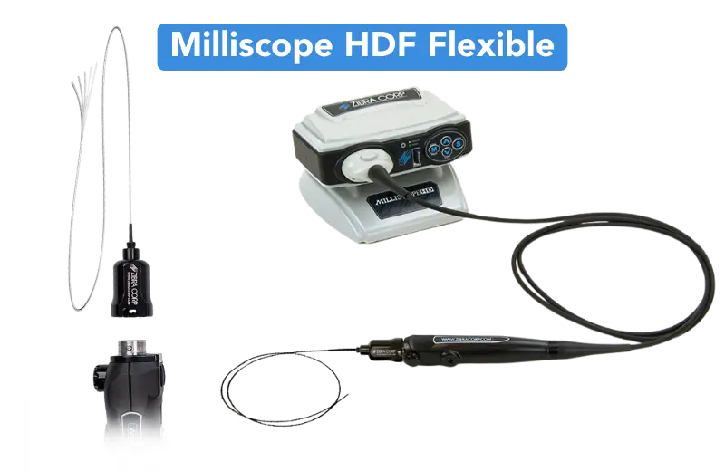 Compatible with the standard Milliscope HD Base Unit, these flexible fiber borescopes bend around tight elbows and narrow diameters. Choose from diameters as small as 0.3 mm to 1.5 mm, different directions-of-view (DOV), field-of-view (FOV), and lengths.