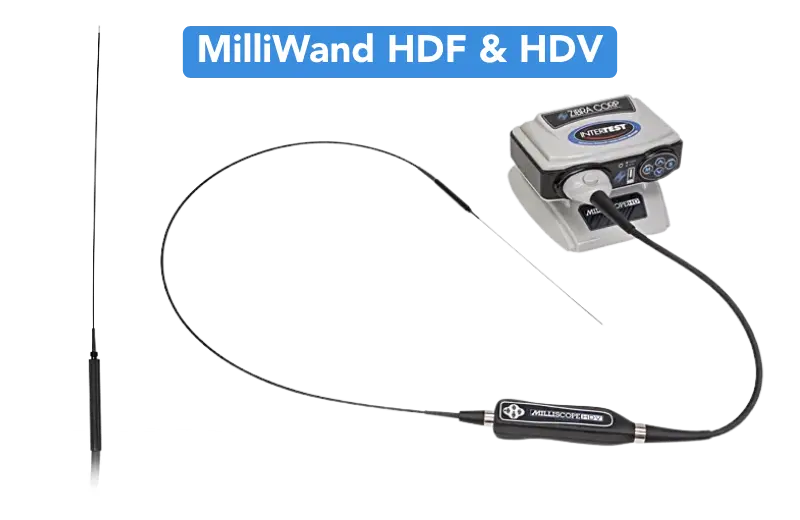 Compatible with the Milliscope HD Base Unit, the MilliWand features an ergonomic handle with flexible or semi-rigid fiberscope versions or video borescope versions.