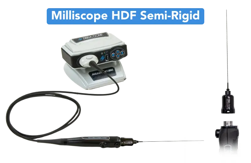Compatible with the Milliscope HD Base Unit, semi-rigid fiber borescopes are suited for straight and narrow openings. Choose from diameters as small as 0.3 mm to 1.5 mm, different directions-of-view (DOV), field-of-view (FOV), and lengths.